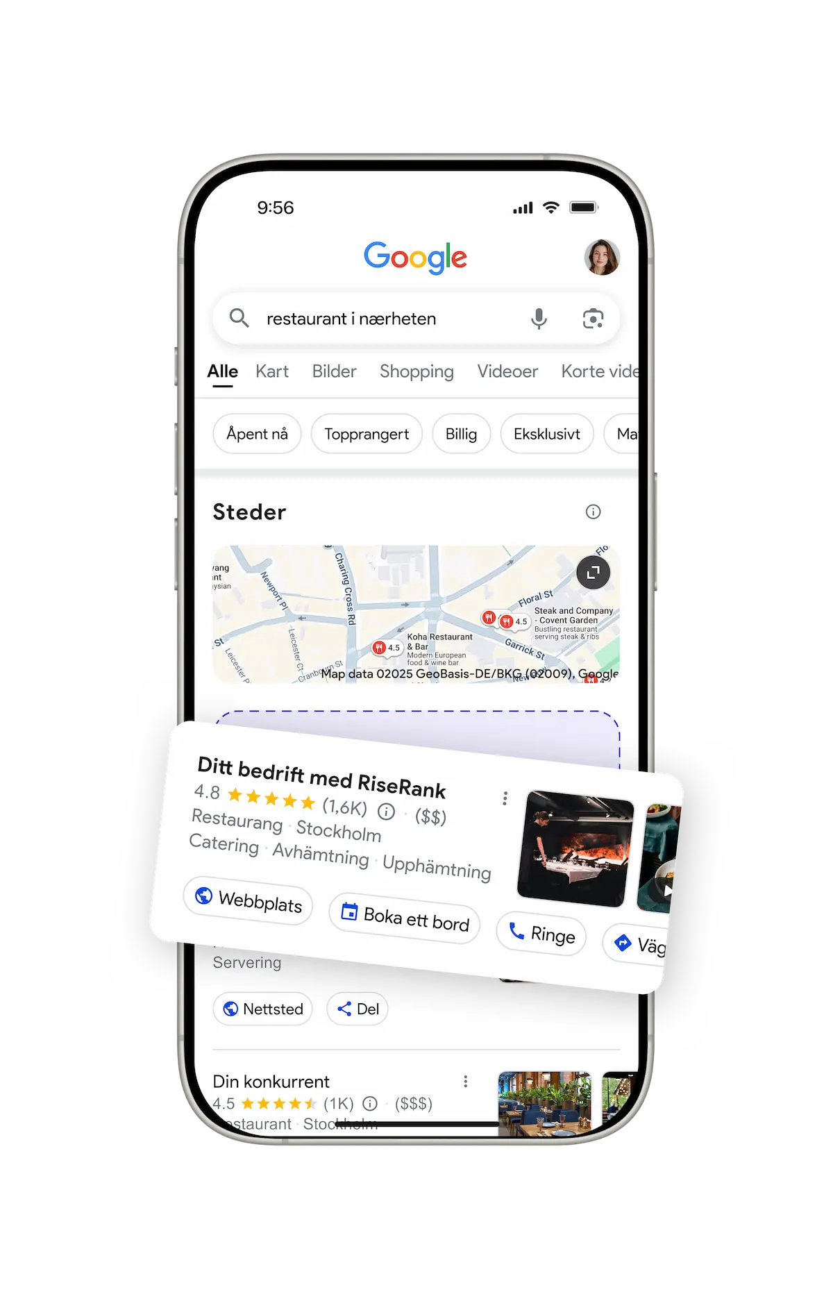 Tjenesten vår øker synligheten og rangeringen betydelig på store plattformer som Google, Google Maps og Apple Maps.