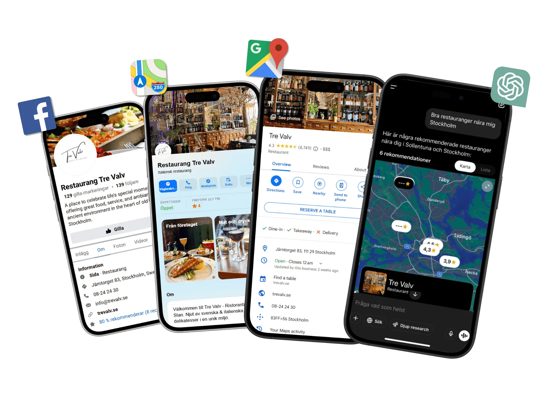 Med RiseRank slipper du manuellt uppdatera varje enskild plattform. Vi ser till att dina kontaktuppgifter, bilder och erbjudanden hålls aktuella på över 30 viktiga sidor och appar.